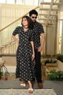 Stylish and coordinated red cotton couple outfit featuring vertical vine hand block prints. The breezy dress with a V-neck and the casual short-sleeve shirt make this a versatile duo for casual outings or festive gatherings.